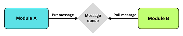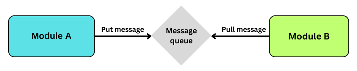 Modulul A trimite un mesaj unui broker de mesaje în manieră fire-and-forget. Modulul B se abonează la mesajele relevante și le gestionează corespunzător.