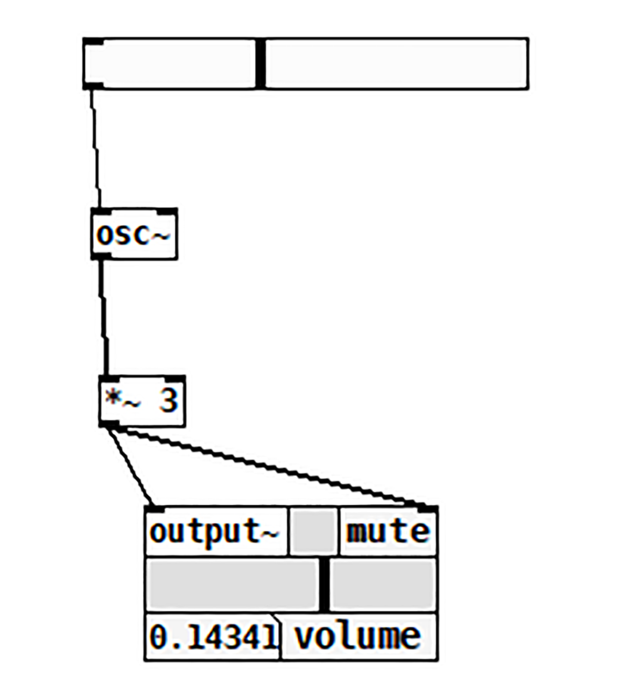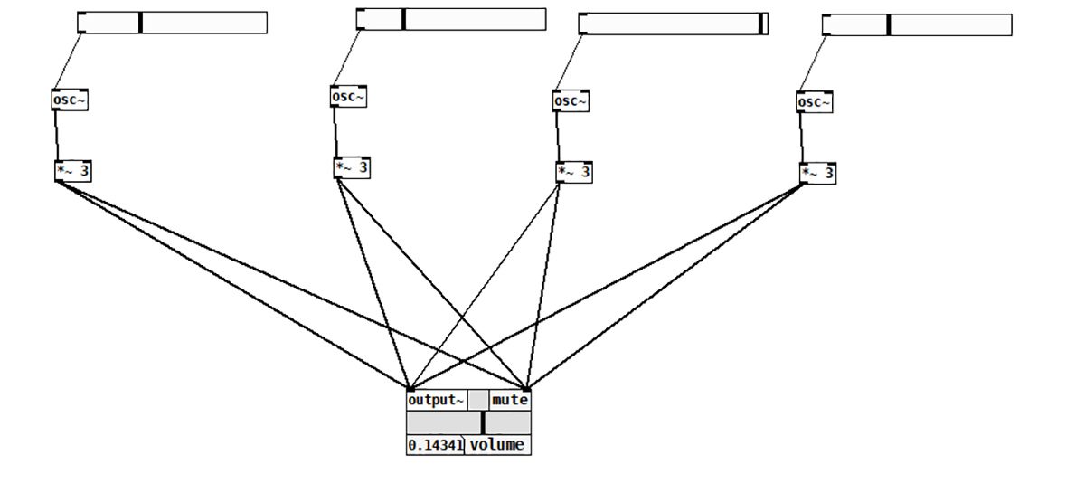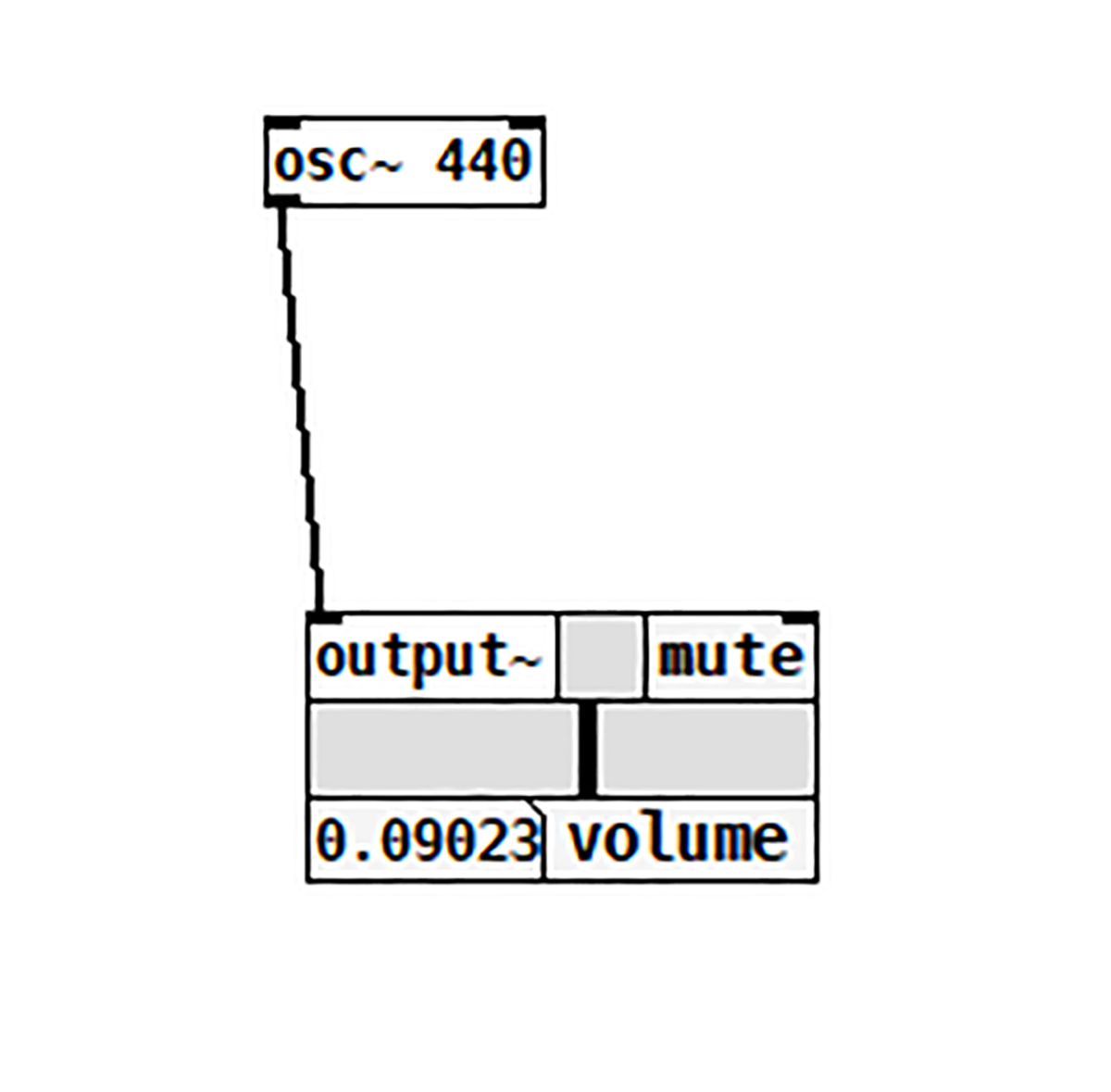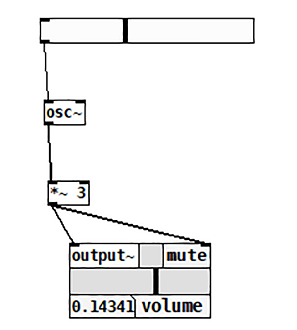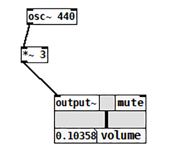 Vom deschide un nou fișier (New) și vom adăuga un osciloscop. Pentru acesta vom apăsa ctrl+1, iar în căsuța apărută vom scrie: osc~ 440 și vom da click în exterior. Așa cum v-ați dat seama, osc reprezintă un osciloscop, iar 440 este frecvența acestuia. Semnul ~ ne informează că avem de a face cu un sunet și nu cu valori scalare. Următorul pas este să adăugăm o nouă componentă (ctrl+1) și vom scrie output~. Această comandă ne generează un endpoint ce comunică cu placa de sunet a calculatorului. Conectăm cele două componente la fel ca în următoarea diagramă.