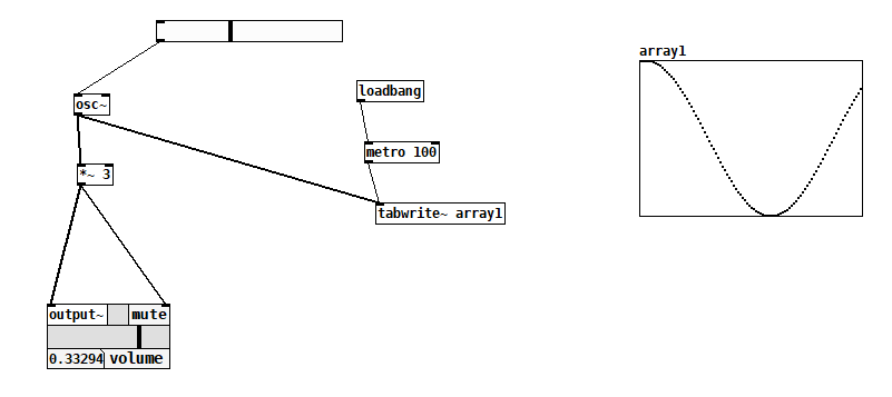 loadbang - ne declanșează un semnal de pornire la inițializarea aplicației.metro 100 - generează un semnal odată la 100 de milisecunde.tabwrite~ array1 - va scrie în tabelul array1 datele primite la osciloscop și va repeta această operațiune pentru fiecare semnal primit de la metronomul de mai sus.Observație: Pentru a putea vizualiza osciloscopul din array1 va trebui să salvați și să redeschideți aplicația.
