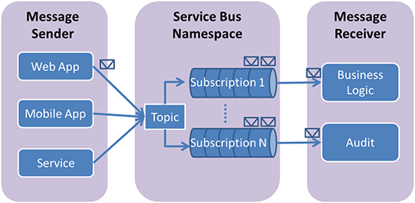 Azure Service Bus Topics oferă suport pentru un mecanism de mesaje pe tiparul publicare-abonare unde producătorii publică mesaje în topicuri, iar abonații primesc mesaje pe baza abonamentelor lor.