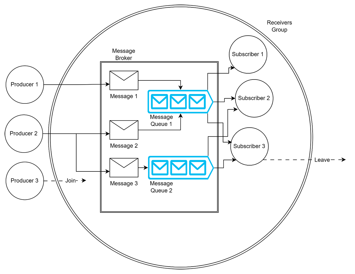 Fiecare serviciu abonat primește doar mesajele relevante operațiunilor sale și le procesează în consecință.