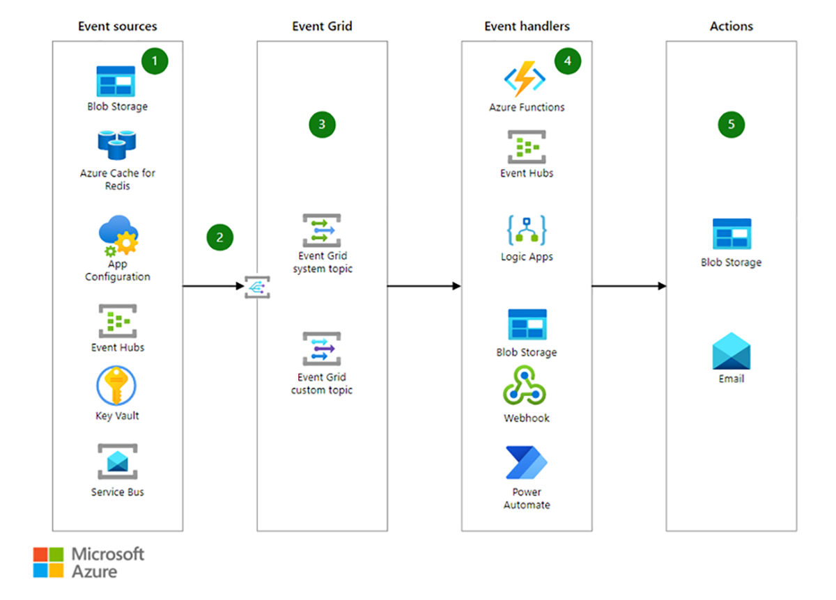 Exemplu: O aplicație cloud emite evenimente către Event Grid de fiecare dată când se generează evenimente pentru activități precum crearea de resurse, ceea ce declanșează acțiuni în Azure Functions sau Logic Apps.