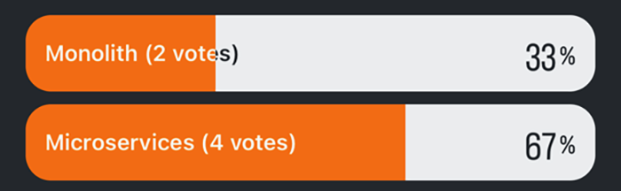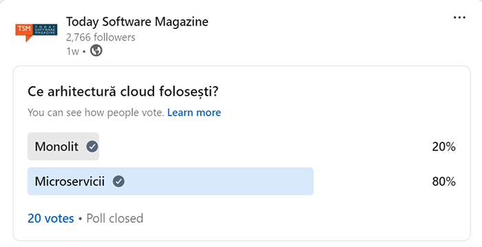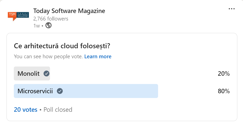 Așa cum ne-am așteptat într-o lume în care toate serviciile au migrat de mulți ani în cloud, votul majoritar a desemnat ca arhitectură câștigătoare microserviciile. Chiar și așa, considerând noile tehnologii și abordări, s-ar putea ca arhitecturile monolit modificate să se potrivească mai bine în anumite cazuri.