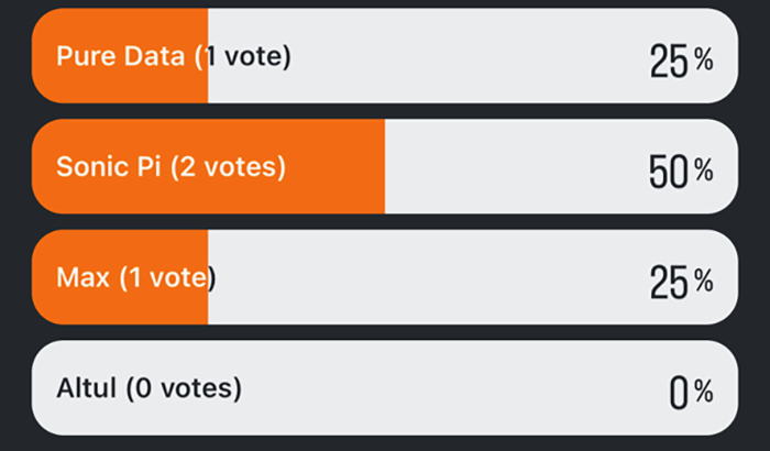 Deși cu nu foarte multe voturi în plus, SonicPi se bucură de cea mai bună popularitate printre cei ce îndrăgesc muzica generată pe calculator.
