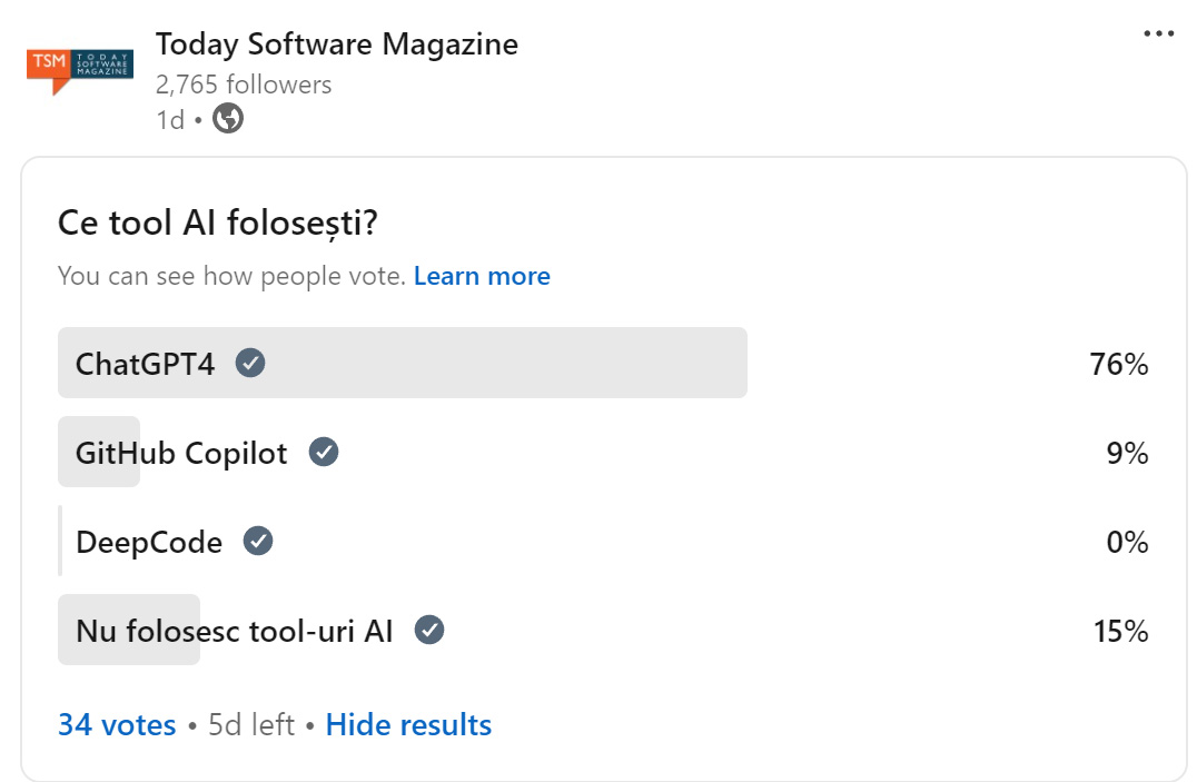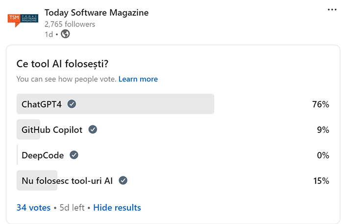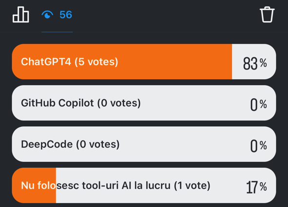Deși este un tool general, ChatGPT4 reprezintă alegerea majorității așa cum era și previzibil. Numărul celor care nu folosesc deocamdată soluții AI se păstrează într-o limită rezonabilă de sub 20%.
