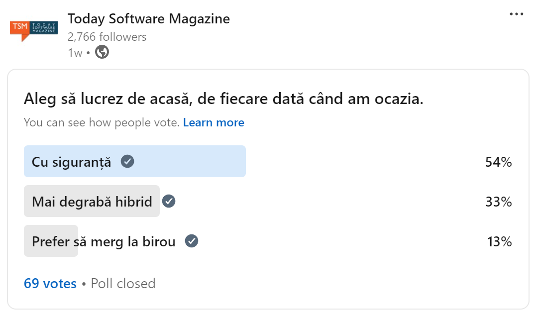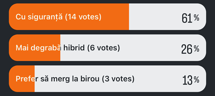Pandemia a schimbat cu siguranță modul în care lucrăm, fapt care se vede în preferințele celor care au votat. Având peste 90 de voturi în total putem spune că acest sondaj este reprezentativ pentru cei ce ne urmăresc pe LinkedIn sau Instagram. Numărul celor care preferă să meargă la birou este de doar 13% în vreme ce majoritatea preferă să lucreze de acasă.