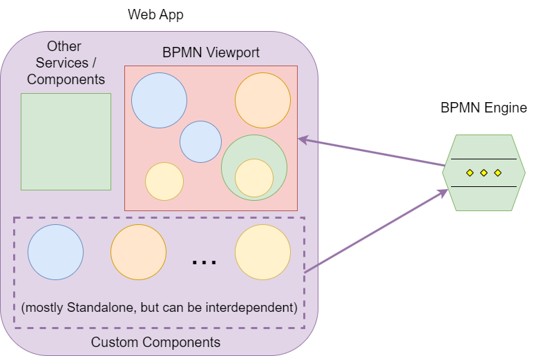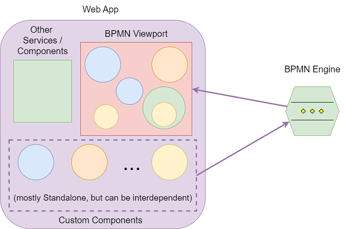 Prezența acestor componente singulare și utilizarea lor într-un mod decuplat vine la rândul ei cu un impact asupra arhitecturii unei aplicații web care folosește un BPMN "în spate". O astfel de aplicație nu are nevoie de mai multe pagini, de o separare a elementelor în componente inteligente și componente proaste sau de o structură comună de componente părinți și copii. Pentru o astfel de aplicație este de ajuns crearea unei ferestre de vizualizare a conținutului redat de BPMN și a componentelor reutilizabile, care pot să fie grupate sub forma unei librării de elemente, acestea fiind folosite doar prin invocarea și redarea directă din BPMN.