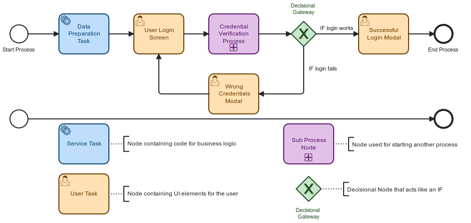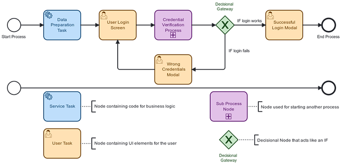 Cum funcționează asta în spate? Într-un mod destul de simplu de înțeles. La un nivel destul de abstract, putem privi un BPMN ca pe o simplă mașină de stare sau ca pe un model comportamental bine programat pentru fiecare ramură logică pe care să meargă. Într-o diagramă de flux, pașii pe care utilizatorul îi poate face sunt bine definiți, acordând predictibilitatea necesară pentru a controla întreaga aplicație la un nivel macro și pentru a ști mereu ce date vor fi necesare în următoarele etape și ce informații nu mai sunt relevante.