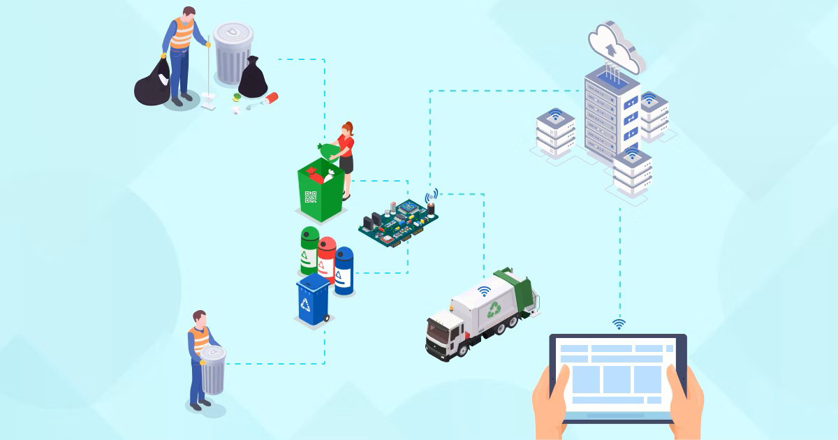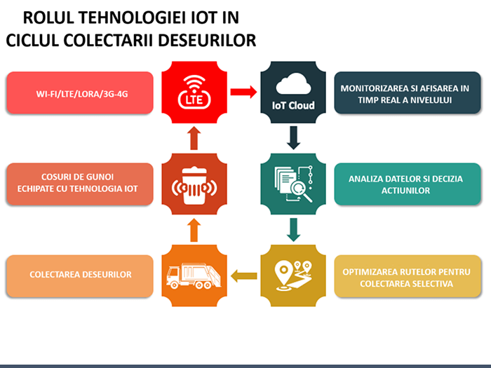 Tehnologiile IoT (senzori de nivel, RFID, olfactivi, optici și cântare) colaborează pentru a dezvolta un sistem integrat de gestionare a deșeurilor. Prin colectarea datelor precise și în timp real, acest sistem garantează separarea corectă a materialelor reciclabile, optimizând procesul de colectare și reciclare.