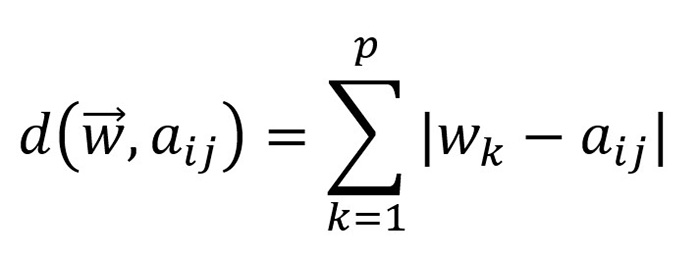 Presupunând că avem cuvântul w și valoarea d, iar index este poziția lui w în d, facem o reducție modulo 1 a poziției detectate pentru a ne asigura că avem tot timpul 1 ca distanță maximă dintre un cuvânt și valoarea unui element al matricii. De aici deducem că distanța unei linii este o sumă de distanțe ale elementelor. Astfel, valoarea 0 indică cea mai mare potrivire a căutării pe când valoarea 1 nu indică nicio potrivire. În limbajul de programare JavaScript se poate scrie: