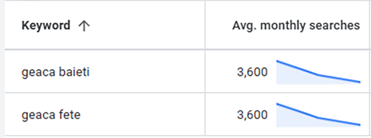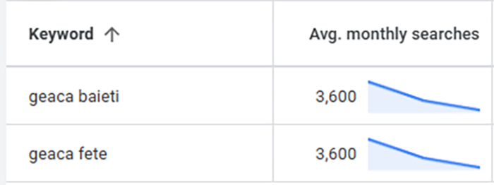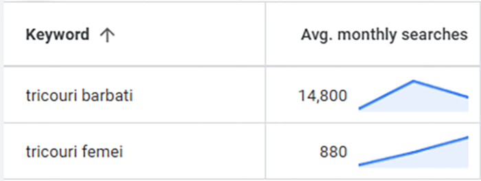 Cele două pagini pot fi două categorii cu trafic, volum de căutare și rankinguri similare. În exemplul de mai jos, putem compara categoria Geci Băieți cu Geci Fete, având un volum de căutări similar, dar nu ar fi indicată o comparație între Tricouri Bărbați și Tricouri Femei, din cauza diferenței de volum de căutări lunare.
