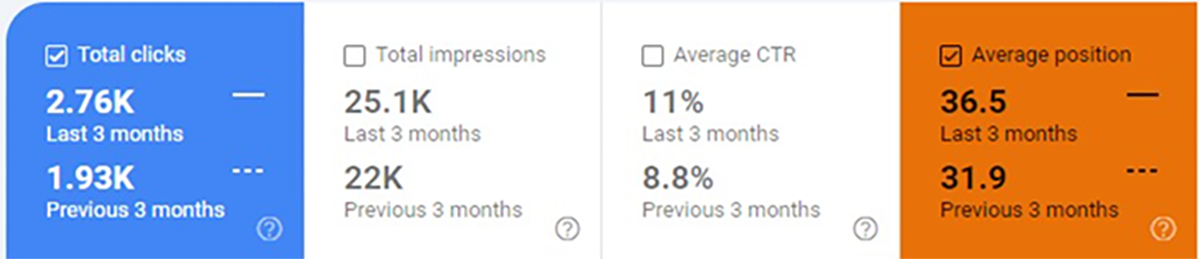 Comparare metrici de Clickuri, Impresii, CTR, Poziție Medie în Google Search Console