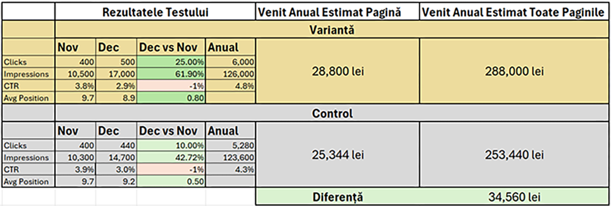Prin creșterea CTR-ului cu 2%, traficului adus de pagina de categorie testată va crește cu 15%. Astfel vom obține o creștere a venitului cu 7%, în valoare de 500 lei pe lună. Prin scalarea soluției la toate cele 10 categorii, venitul va crește cu 5,000 lei pe lună, 60,000 lei pe an.