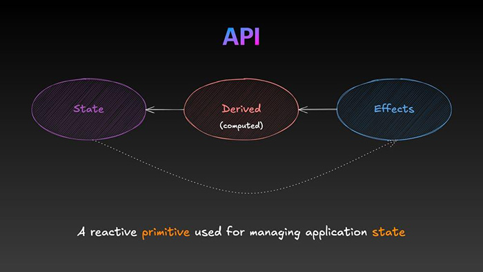 Lazy by default - Dacă un copac cade în pădure, și nimeni nu l-a auzit căzând, face zgomot? Astfel, dacă un state nu este legat în nici un fel de alte state-uri sau efecte, acesta nu face parte din graficul de dependințe, deci nu trebuie urmărit. De asemenea, state-ul derivat este evaluat doar atunci când o dependință este invocată și nu în momentul în care este declarat.