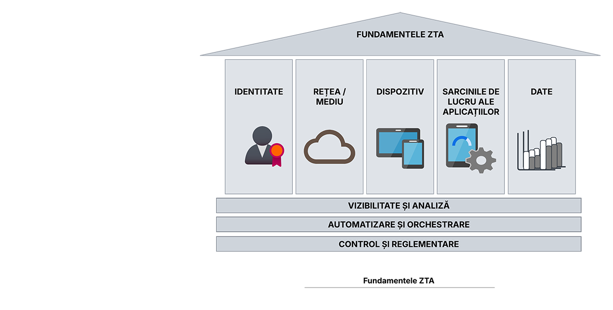 Zero Trust Architecture (ZTA) se bazează pe principii fundamentale care îmbunătățesc securitatea cibernetică, punând accent pe validare continuă și controale stricte de acces, spre deosebire de modelele tradiționale bazate pe perimetru, care presupun implicit că rețelele interne sunt de încredere. Iată principalele componente care stau la baza ZTA: