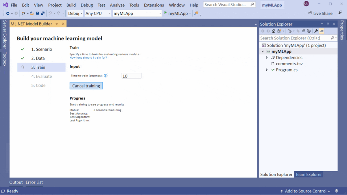 Pentru a simplifica lucrurile, ML.net oferă pachetul AutoML & Model Builder. Model Builder este un instrument similar unui wizard, cu suport CLI care face ca lucrul cu ML să fie ușor și rapid. Model Builder este reprezentat în figura 2.