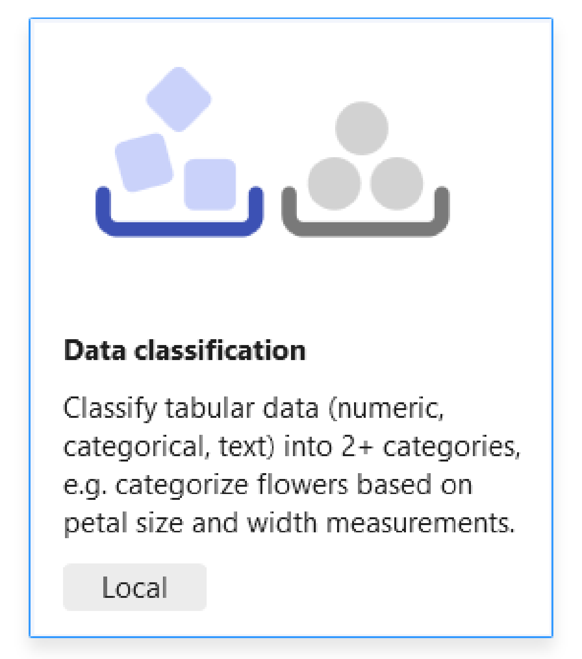 Clasificarea multi-clasă prezice clasa sau categoria unei instanțe de date. Poate fi folosită pentru a cataloga zborurile în termeni precum: "devreme", "la timp", or "întârziat", pentru a cataloga recenziile de film în termeni precum: "pozitiv", "neutru" sau "negativ" sau chiar pentru a cataloga recenziile unui hotel după criterii precum "locație", "preț", "curățenie". Figura 3 arată scenariul de clasificare a datelor, așa cum este acesta disponibil din wizardul ml.net.