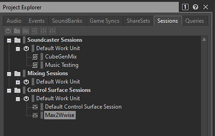 Pentru a conecta dispozitive MIDI, în Wwise se poate crea o nouă sesiune Control Surface în tab-ul Sessions, sub Control Surface Sessions și Default Work Unit. Asta le va permite utilizatorilor să asocieze mesajele MIDI primite din Max/MSP cu diferite events din Wwise.