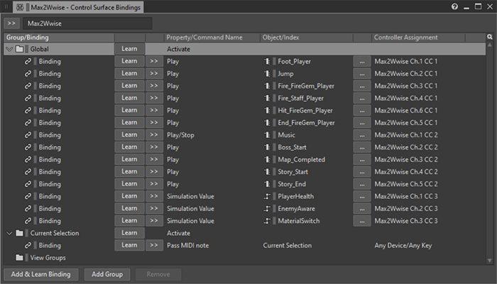În sesiunea Control Surface din Wwise, au fost create următoarele asocieri legate de Max: