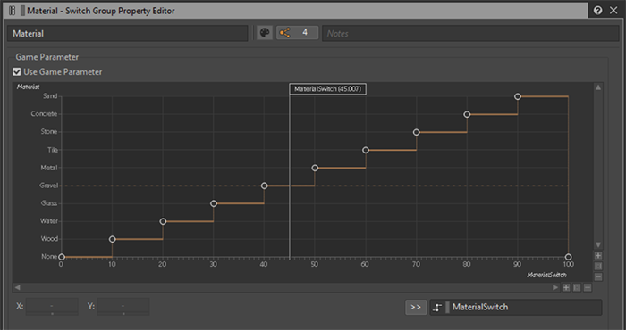 Deoarece eventul de pași declanșează un Switch Container, în Wwise a fost creat un game parameter suplimentar denumit "MaterialSwitch" pentru switch-ul "Material".