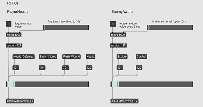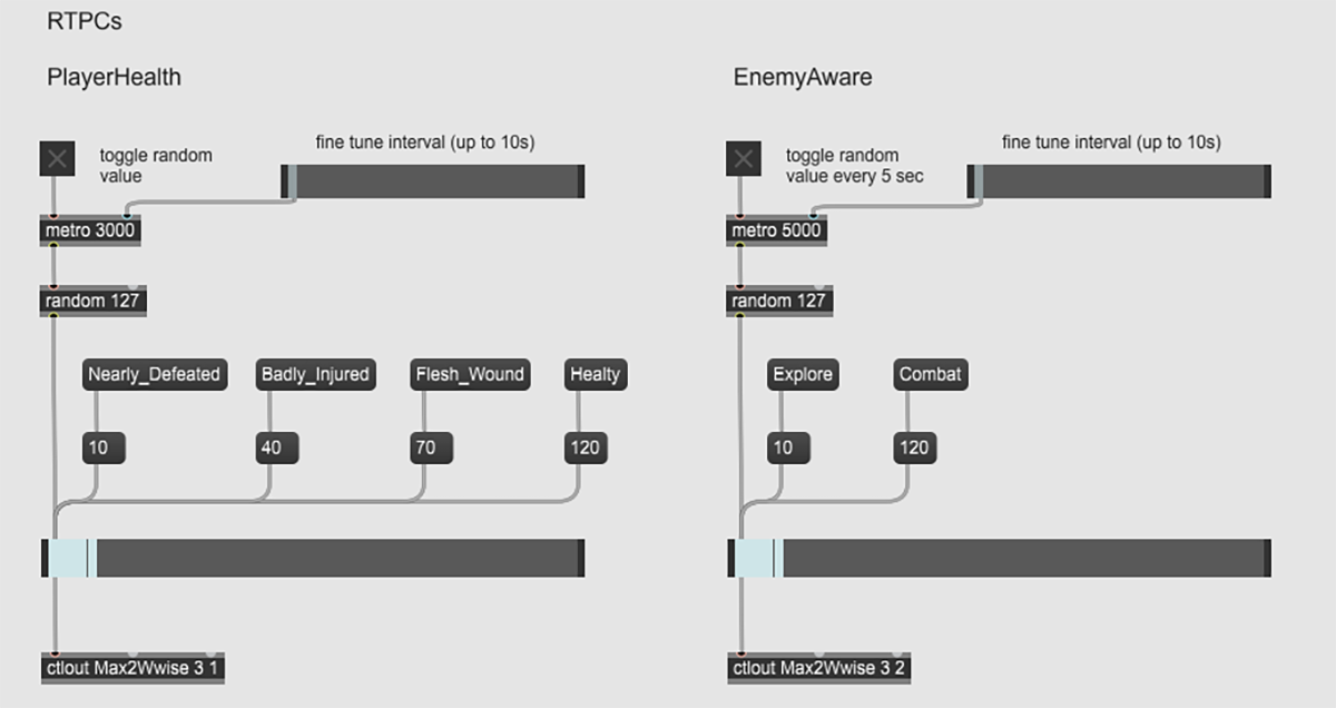 În final, eventul care declanșează muzica în joc, are un toggle on/off și este însoțit de mai multe triggere care schimbă game states în funcție de evenimentele din timpul gameplay-ului. Eventuri precum, o luptă cu un boss, începutul și sfârșitul unei secțiuni din joc etc. sunt declanșate aleatoriu, însă sistemul muzical este influențat și de RTPC-urile "PlayerHealth" și "EnemyAware". Randomizarea acestor 2 RTPC-uri și a music states va oferi o simulare a gameplay-ului, redând astfel comportamentul sistemului muzical din joc.