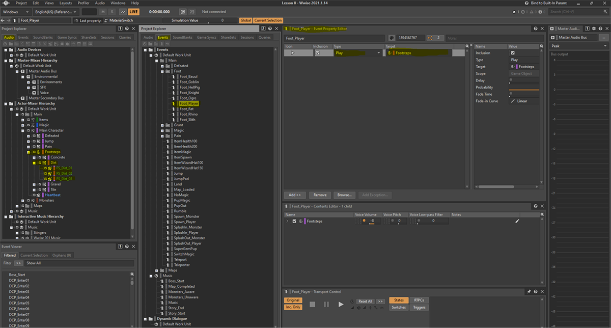 Pentru a înțelege mai bine cum funcționează Wwise, vom analiza o configurație de sistem foley. În exemplul de mai jos, evenimentul selectat "Foot_Player" are o acțiune de tip "Play" care vizează Switch Container-ul "Footsteps". În partea stângă, în tabul Audio, putem vedea că containerul Footsteps conține patru sub-foldere de tip Random Containers în arborele său de directoare, numite Concrete, Dirt, Gravel și Tile, fiecare conținând trei fișiere audio. Există și un material switch asociat containerului Footsteps, care va selecta materialul specificat de game engine, iar în cadrul Switch Container-ului, respectivele Random Containers sunt atribuite fiecărei valori ale switchului.