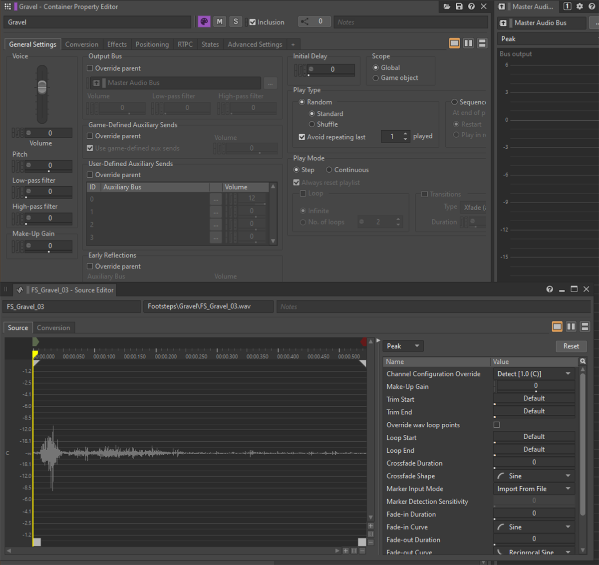 În acest proiect, cele patru Random Containers conțin câte trei fișiere audio, denumite în Wwise SFX objects. Mai putem observa și că modul de redare al fiecărui Random Container (Play Mode) este setat pe Step și că fiecare fișier de tip Sound SFX redă exact un singur sunet de pas.