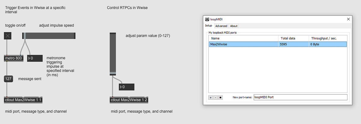 În acest caz, argumentele pentru ctlout vor fi "Max2Wwise", adică numele portului așa cum a fost configurat în loopMIDI, urmat de un număr care reprezintă controllerul (fiecare având 16 canale). Ultimul argument este canalul MIDI, care va fi atribuit individual fiecărui event din Wwise. Este important ca fiecare event să aibă atribuită propria combinație unică de controller și canal pentru a preveni declanșări multiple accidentale.