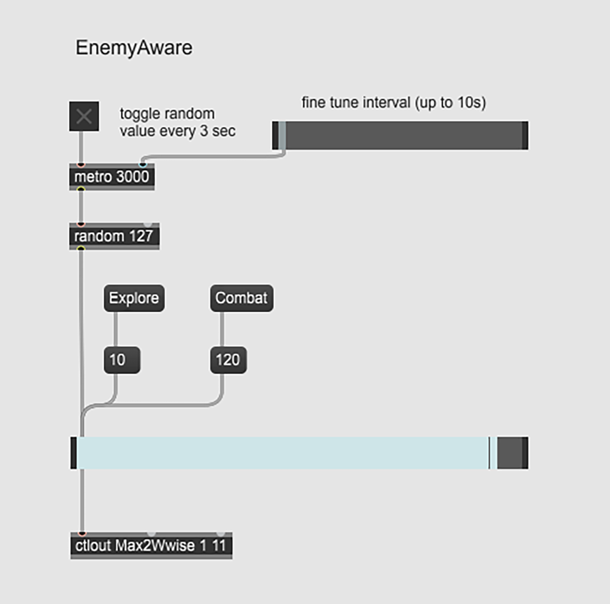 În exemplul din figura alăturată, parametrul EnemyAware are un interval de la -1 la 101 în Wwise, iar Max trimite mesaje MIDI în intervalul 0-127. Trimiterea valorii 120 din Max este scalată automat la intervalul parametrului EnemyAware, rezultând o valoare nouă: 95.378.