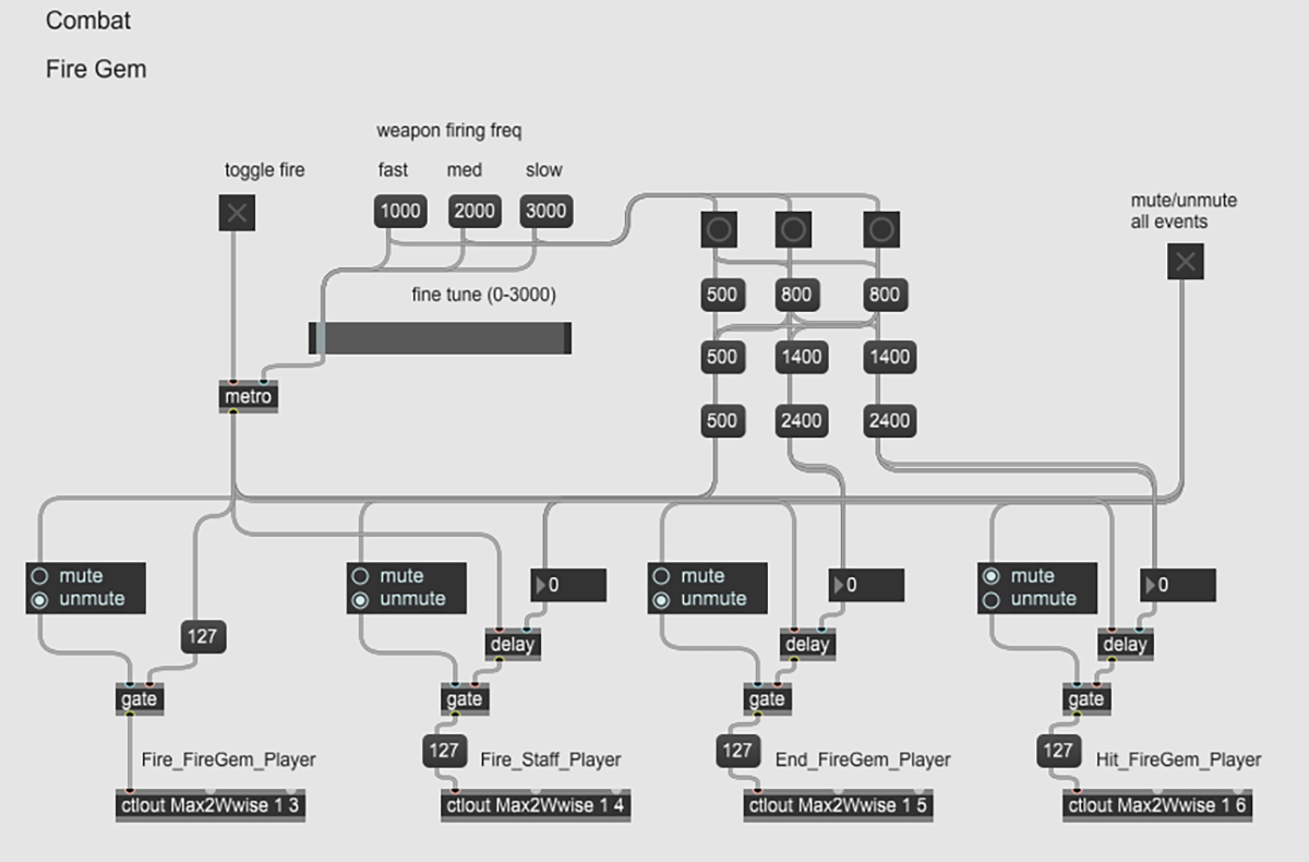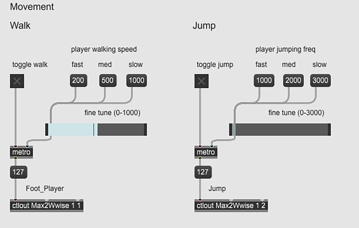 În Max, obiectele fundamentale ale patchului la care vom lucra sunt metro și ctlout. Metro este folosit pentru a genera un mesaj bang la un interval regulat specificat în milisecunde. Intuitiv, acesta va fi motorul care va declanșa mesaje succesive pentru eventurile repetitive, precum pașii sau focul de armă în Wwise. Ctlout este obiectul care ne permite să trimitem mesaje MIDI de control continuu (Continuous Control - CC) către Wwise, acesta acceptând ca argumente portul, controllerul și canalul.