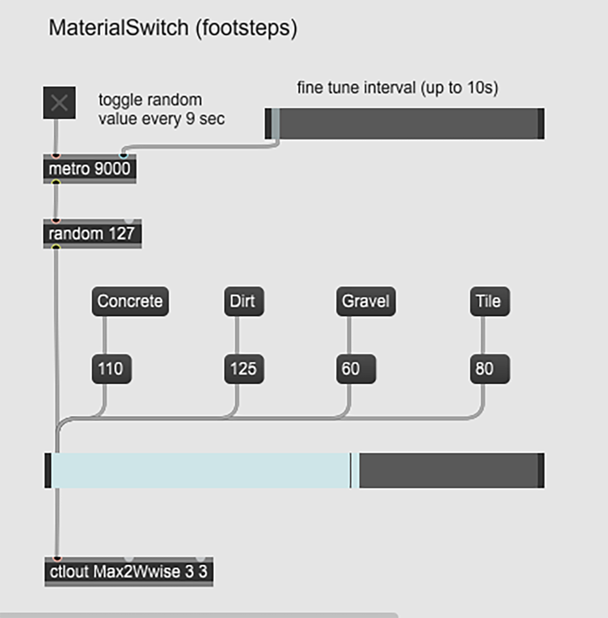 Acum, materialele pot fi controlate și din Max/MSP, iar randomizarea suprafeței pe care calcă jucătorul poate fi activată printr-un toggle sau pur și simplu se poate selecta materialul dorit.