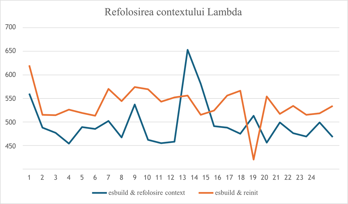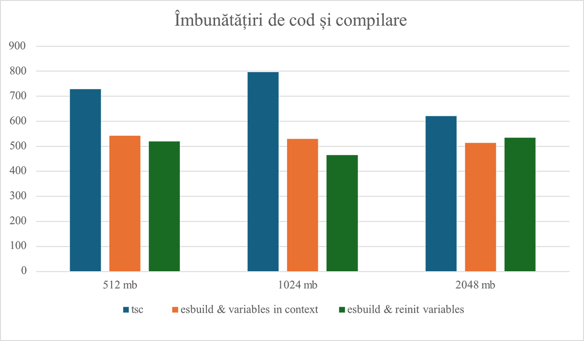 În plus, evitarea inițializării repetate a variabilelor prin folosirea contextului funcției poate contribui la reducerea timpului de execuție. Aceste aspecte pot fi observate mai clar în graficul anterior (Figura 2), în care cold startul este direct influențat de dimensiunea codului final compilat.