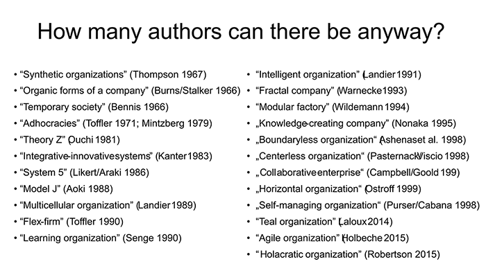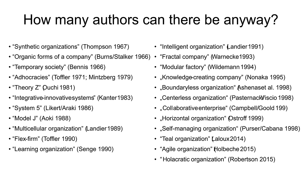 Sociologul german Stefan Kühl, profesor la Universitatea din Bielefeld și consultant la Metaplan, arată în lucrările sale că majoritatea principiilor de organizare pe care le numim astăzi "agile" sunt, de fapt, iterații moderne ale unor concepte dezvoltate în secolul XX. Modele precum team autonomy, decentralized decision-making, cross-functional collaboration sau feedback loops existau deja sub diverse forme în anii '20 și '30. De exemplu, ideea de "echipă cross-funcțional" avea un corespondent conceptual în "autonomous working teams", termen folosit în literatura de management interbelică.