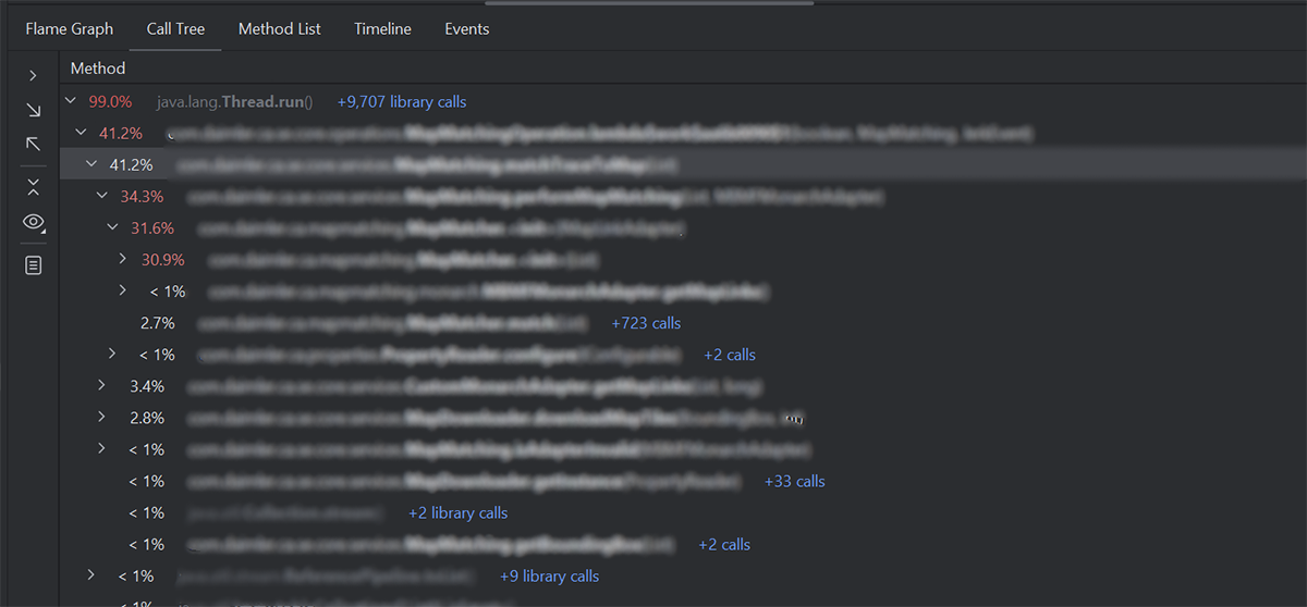 Iată cum arată un exemplu de call tree în profiler-ul din IntelliJ — fiecare ramură arată ce metode au fost apelate și cât timp au consumat (procentual) din totalul execuției.