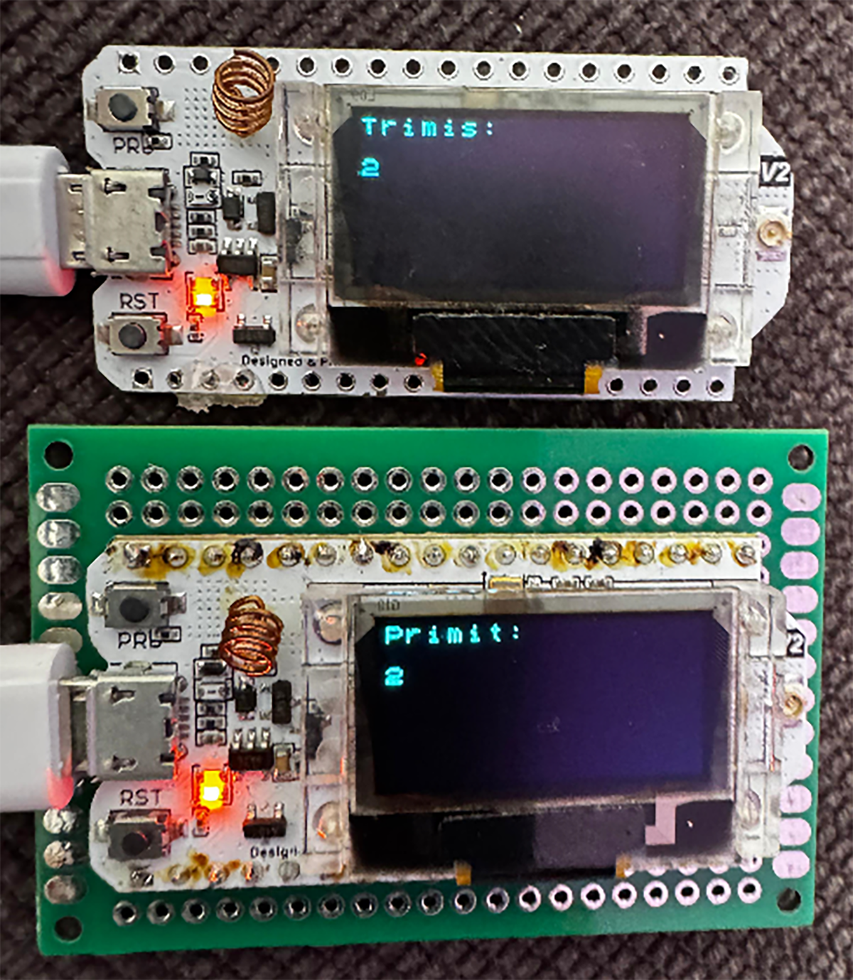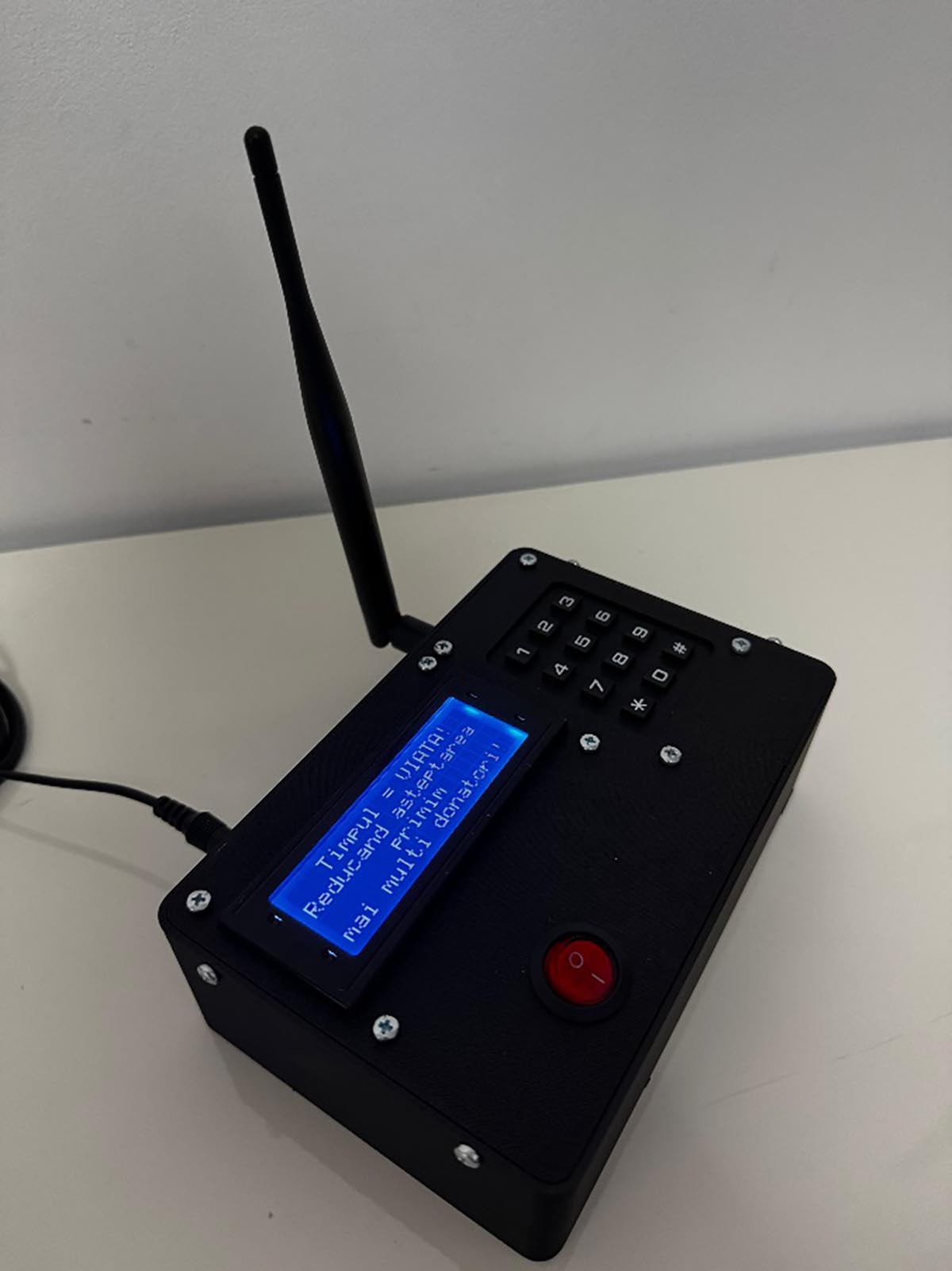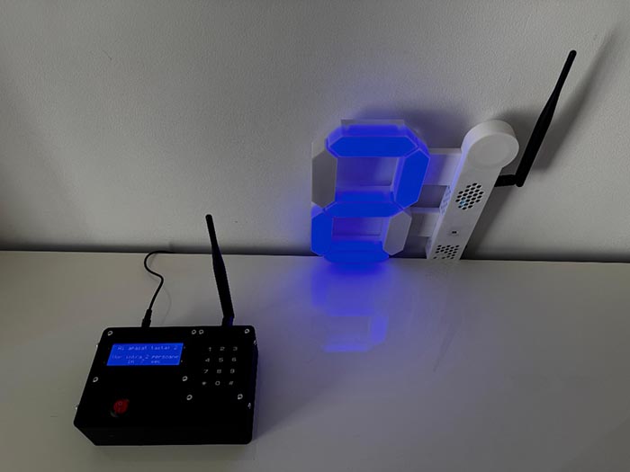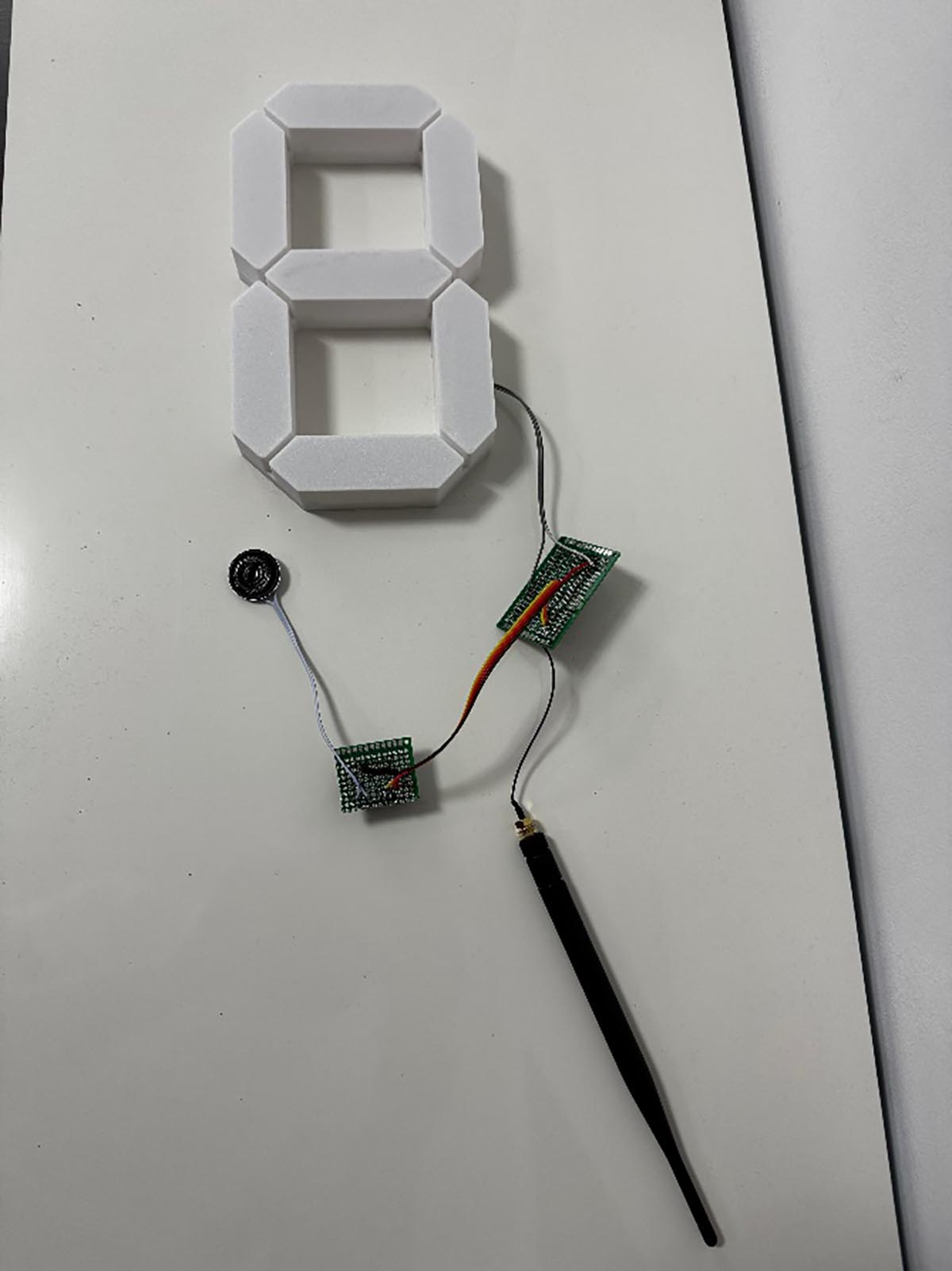 Modulul Slave: procesor Heltec LoRa 32 v2, integrat într-o carcasă imprimată 3D sub forma unui digit cu 7 segmente (LED-uri) și un difuzor activ (ce redă fișierele mp3 stocate pe un card micro SD).