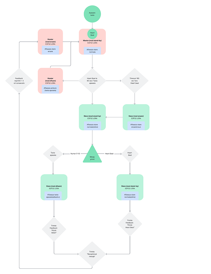 Comunicarea și transmisia de date se realizează strict între două puncte — master și slave — ceea ce oferă un grad ridicat de securitate și fiabilitate. Prin utilizarea unui singur canal radio și a unui cod de sincronizare (SYNC_WORD = 0xAB), mesajele sunt criptate la nivel de acces și recunoscute doar de dispozitivele din perechea autorizată, prevenind interceptarea sau interferențele din rețea. Sistemul transmite constant mesaje de tip "HEARTBEAT" și așteaptă confirmări ("ACK"), ceea ce permite monitorizarea în timp real a conexiunii și identificarea rapidă a problemelor.