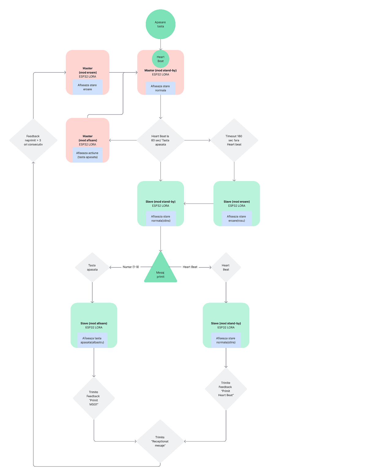 Comunicația se face printr-un protocol personalizat, inspirat din MQTT, în care fiecare mesaj trimis de Master așteaptă:
