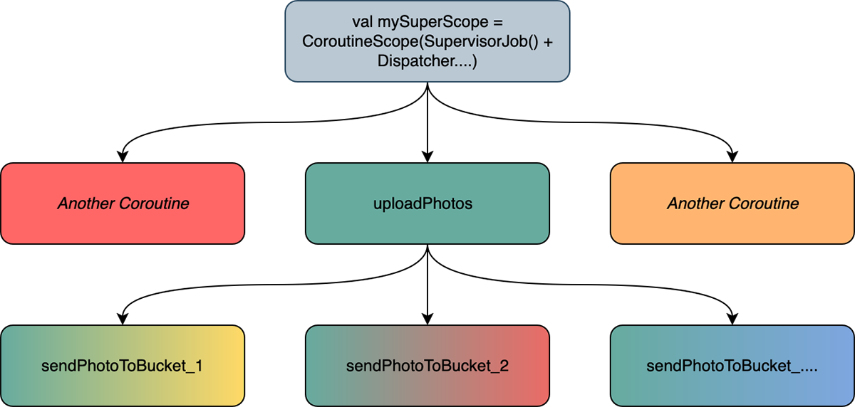 Asta se întâmplă pentru că sendPhotoToBucket nu este copilul direct al lui supervisorScope. Jobul rezultat în urma apelului supervisorScope.launch { ... } este, de fapt, copilul lui supervisorScope, iar toate acele asyncuri sunt, de fapt, "nepoți" ai lui supervisorScope. Iar nepoții nu beneficiază de supervisorScope!