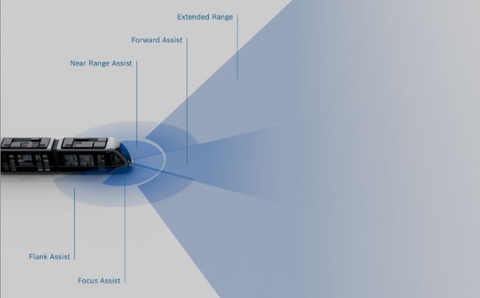 Vederea de aproape (Ultrasonic Sensors - USS6 - senzori ultrasonici): Generația 6 a senzorilor ultrasonici Bosch permite monitorizarea vecinătății imediate a tramvaiului sau a trenului pentru a asigura siguranța în condiții de viteză redusă.