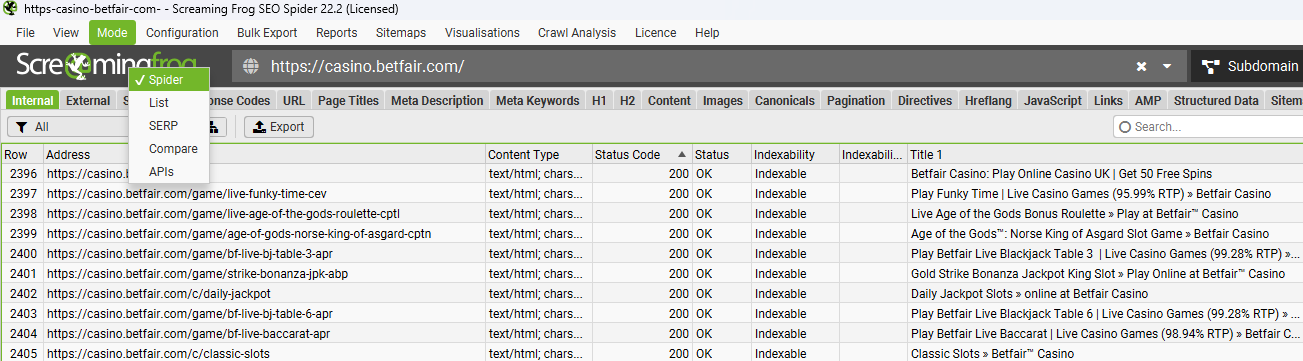 Crawl al site-ului casino.betfair.com folosind Screaming Frog