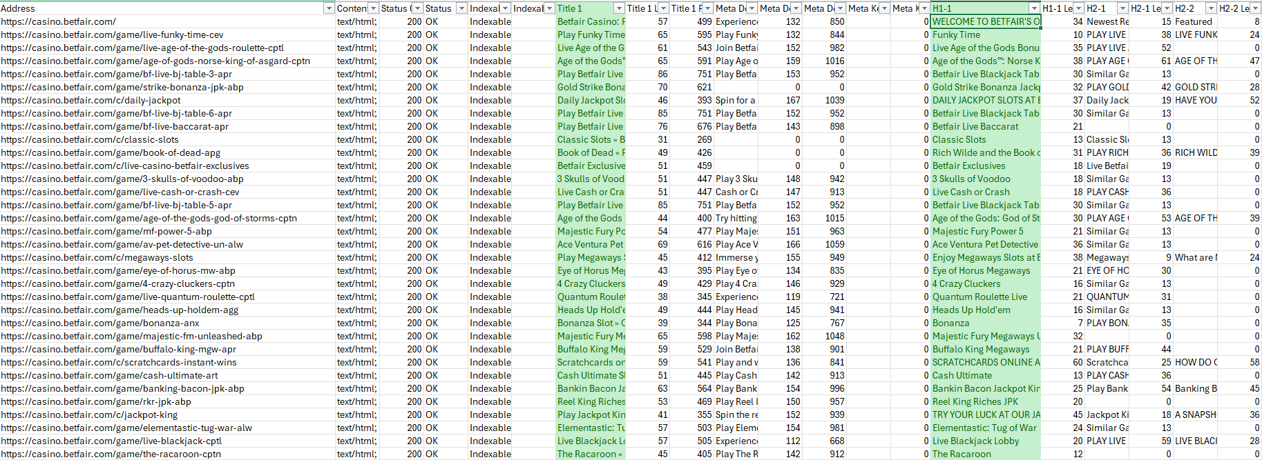 După efectuarea completă a crawlingului, putem extrage datele din Screaming Frog în format .csv. Vom putea folosi datele din coloana Title Tag sau din coloanele de Headings pentru a colecta cele mai relevante cuvinte-cheie și a determina cât de frecvent apar.