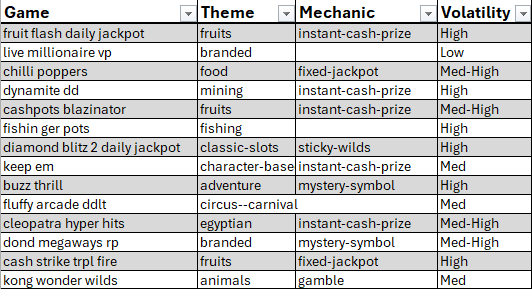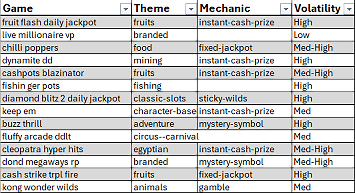 Dacă conținutul site-ului nostru este deja adăugat și clasat în baze de date, putem folosi filtrele existente pentru a identifica noi oportunități de a categoriza conținutul. În exemplul de mai jos se pot vedea câteva variante de filtrare pentru jocurile unui cazinou online (Betfair Casino) pe baza temei, a tipului de bonus și a volatilității fiecărui joc.