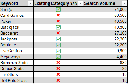 Pentru că site-ul Betfair Casino avea deja o serie de categorii existente, a fost necesar un pas intermediar de identificare a acestora, pentru a exclude o posibilă canibalizare.