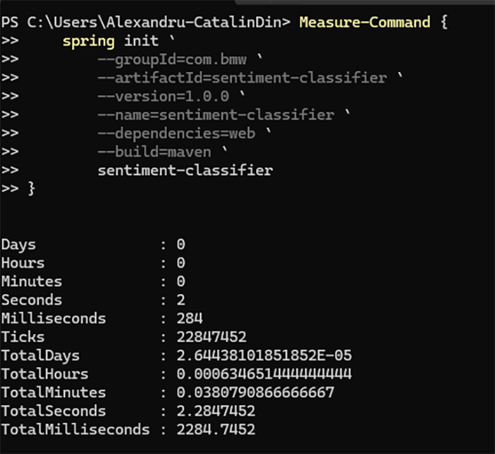 După cum se poate observa, timpul de execuție este similar (~2,3 secunde pentru Spring, ~2,5 secunde pentru Quarkus). Ceea ce este vizibil de la început este că sintaxa Spring CLI este mult mai stufoasă prin comparație cu Quarkus. Asta reflectă perspectiva generală a Quarkus, unde simplitatea este esențială.