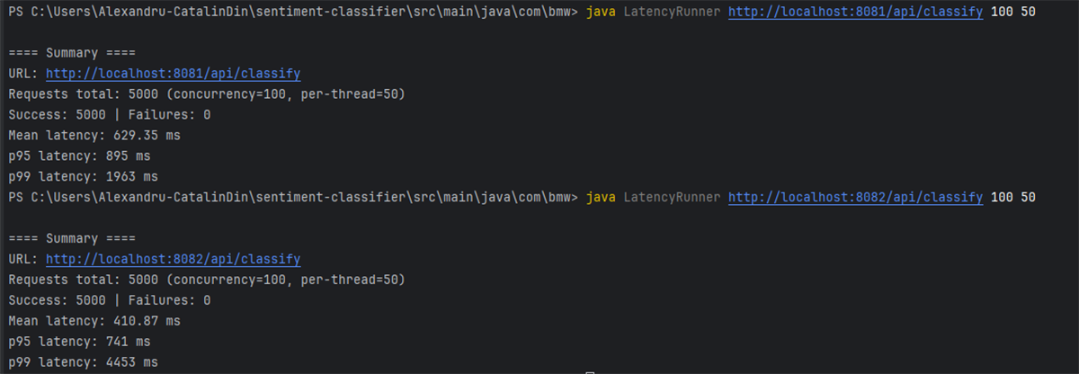 Pentru a surprinde comportamentul fiecărui framework sub trafic real, am scris un mic instrument de măsurători în Java care profită din nou de existența Virtual Threads. Scriptul îmi permite să specific atât numărul de workeri concurenți, cât și numărul de requesturi pe care fiecare worker trebuie să le trimită. Fiecare thread trimite în buclă apeluri HTTP POST către endpointul /api/classify, măsurând timpul pentru fiecare request în parte. După finalizarea tuturor requesturilor, scriptul agregă rezultatele și calculează statistici-cheie: latența medie, precum și percentilele p95 și p99[^6]. Acest set-up oferă o perspectivă mai realistă asupra timpilor de răspuns la scară: nu doar cazul mediu, ci și cât de des și cât de sever apar vârfuri de latență pe măsură ce crește concurența. Rulând scriptul atât pe aplicația Quarkus, cât și a Spring Boot cu parametri identici, am putut obține o comparație corectă a reactivității sub sarcină. Rezultatele pot fi văzute mai jos: