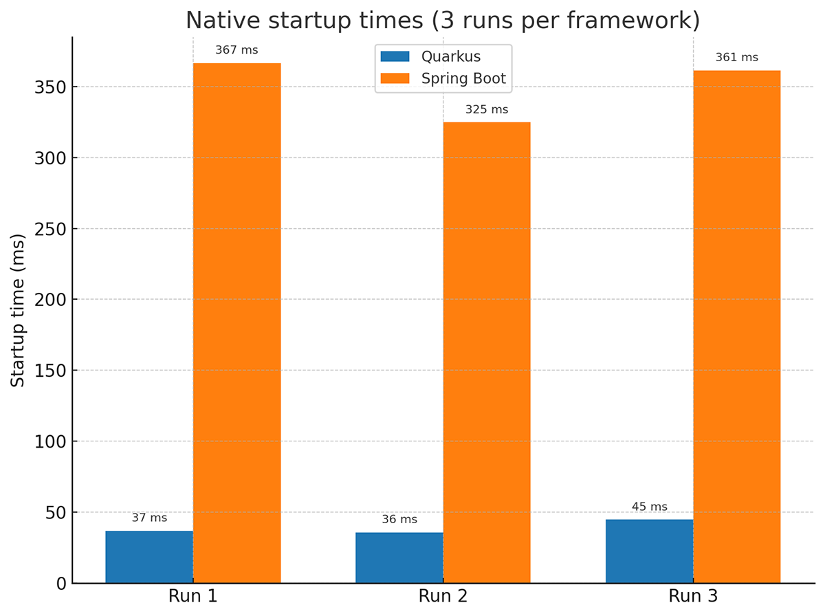O altă măsurătoare interesantă este să vedem cum se schimbă timpul de pornire după ce construiesc aplicațiile ca imagini native. Compilarea cu GraalVM elimină mare parte din scanarea classpathului, deci ne așteptăm la timpi de boot mult mai buni față de folosirea JVM. În cazul Quarkus, aici se vede cu adevărat forța frameworkului: datorită optimizărilor făcute la build, poate porni adesea în câteva zeci de milisecunde, practic instant din perspectiva utilizatorului. Recunosc, prima dată când am văzut asta am crezut că instanța Quarkus încă rula dintr-o pornire anterioară, atât de incredibilă părea viteza.