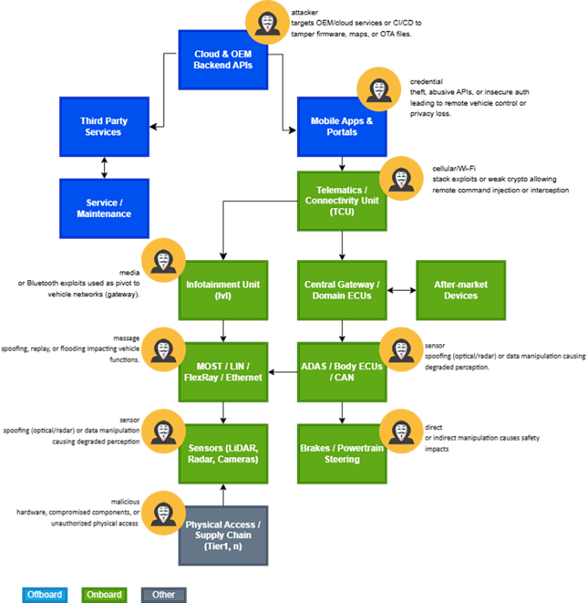 Odată cu apariția tehnologiilor noi și perturbatoare (emerging & disruptive technologies) și a tendințelor emergente, cum ar fi inteligența artificială și învățarea automată (machine learning), rețelele 5G și creșterea numărului de dispozitive IoT, din punct de vedere istoric, atacatorii sunt astăzi mai sofisticați ca niciodată. În timp ce fiecare nou pachet de tehnologii (technology stack) vine cu oportunități unice, acesta poate fi utilizat în ambele moduri: fie pentru a face bine, fie pentru a face rău. Primul motiv constă în valorificarea capacităților echipelor albastre, roșii și purpurii (Blue-, Red- & Purple Teams) pentru a utiliza aceste tehnologii noi în vederea menținerii și consolidării posturii de securitate a organizațiilor. Prin utilizarea frameworkurilor de securitate cibernetică de ultimă generație, cum ar fi MITRE ATT&CK, Automotive Threat Matrix (ATM) sau standardele acceptate de industrie, cum ar fi ISO/SAE21434. Pe de altă parte, cel de-al doilea motiv avantajează actorii malițioși. Exploatând tehnologii precum inteligența artificială, atacatorii pot efectua o gamă largă de activități din umbră, dintre care unele includ executarea de coduri malițioase prin implementarea de sarcini utile (payloads), impersonarea (de exemplu, Deep Fakes) și alte atacuri de tip inginerie socială. Cu ajutorul noilor tehnologii, acest tip de incidente poate fi creat și realizat cu ușurință. Pentru ca lucrurile să se înrăutățească încă și mai tare, atacatorii operează în interiorul deep și dark web în calitate de custozi pentru Ransomware-as-a-Service. RaaS este un model de afaceri de criminalitate informatică în care dezvoltatorii de ransomware comercializează și vând coduri malițioase sau malware altor hackeri, funcționând astfel similar unui model de franciză. Alți vectori de atac în domeniul embedded și auto includ intrarea fără cheie/furtul de pornire fără cheie (keyless go/keyless entry), în care atacatorii folosesc atacuri prin releu (relay) sau bruierea (jamming) semnalului pentru a debloca și porni o mașină. Atacurile cibernetice pot viza sistemele interne ale unui vehicul, cum ar fi porturile USB, WI-Fi sau magistrala CAN (Control Area Network), pentru a obține controlul asupra funcțiilor principale de siguranță ale acestuia, cum ar fi frânarea, direcția sau airbagul. Prin utilizarea unei abordări stratificate (defense-in-depth), atacatorii obțin un punct de sprijin inițial într-un sistem, trecând astfel la sisteme mai atrăgătoare prin efectuarea de mișcări laterale pentru a se deplasa de la un sistem la altul în vederea escaladării ilegale a privilegiilor.