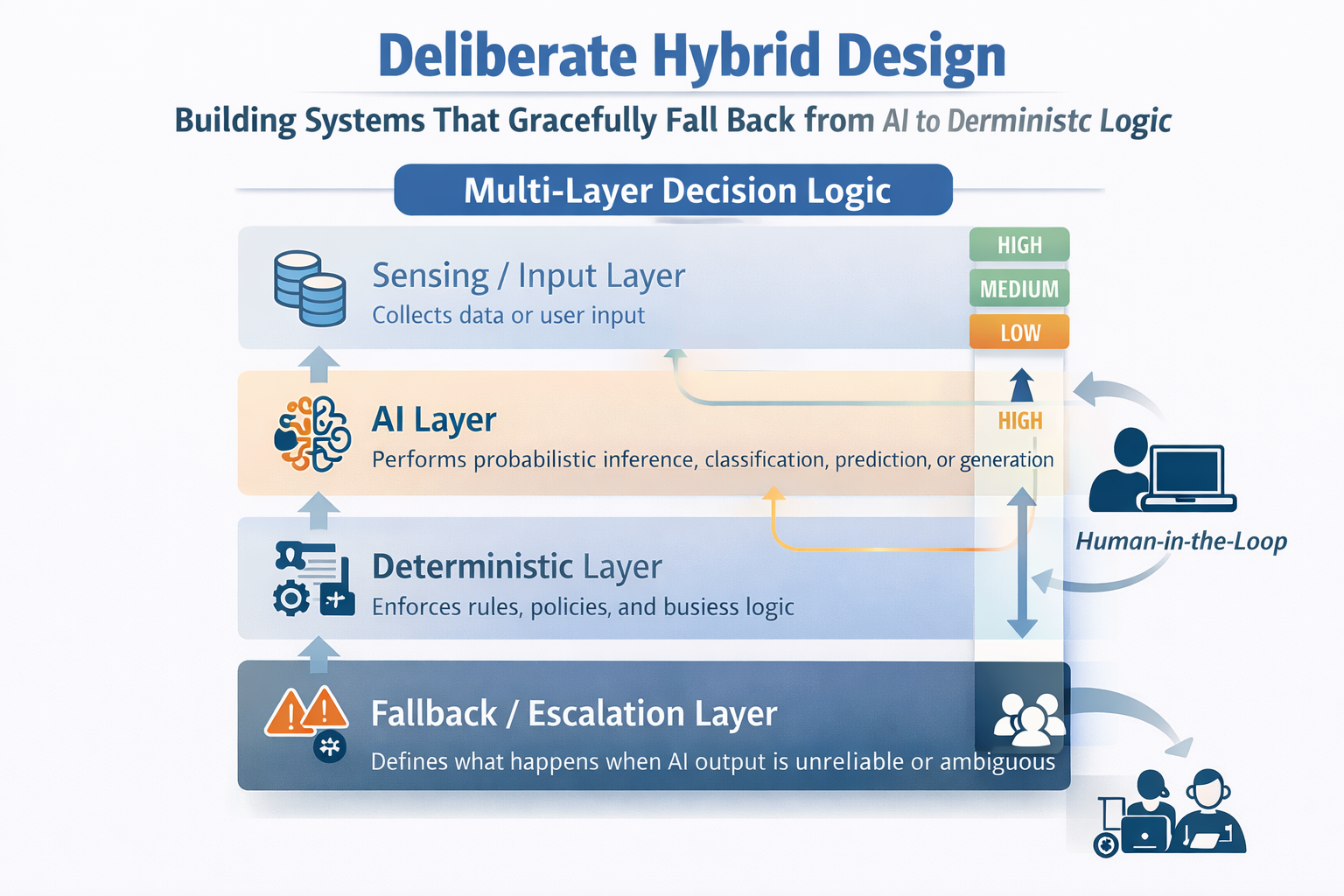 În multe aplicații, deciziile nu trebuie să fie binare (AI vs. reguli). În schimb, acestea pot trece prin mai multe straturi: