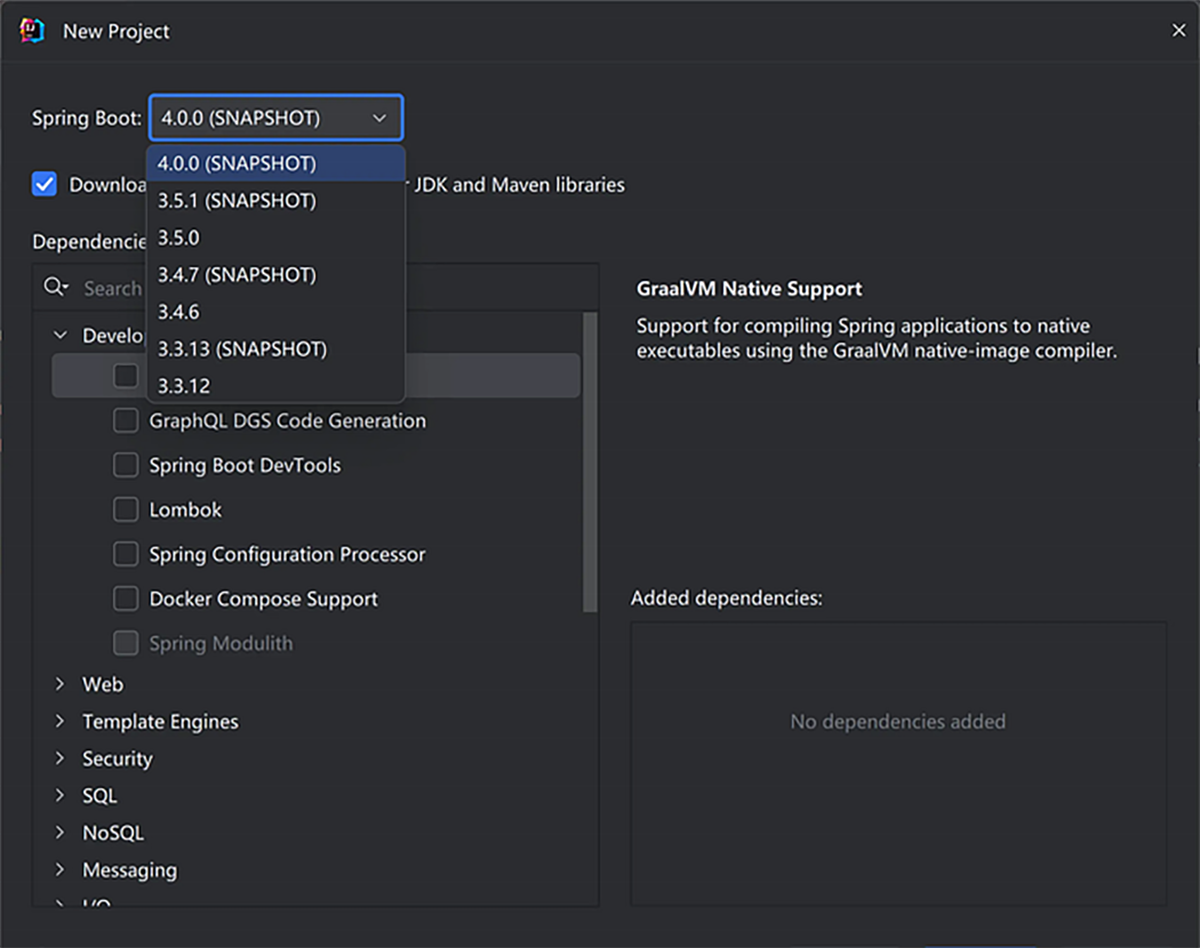 Spring Boot 4 îmbunătățește suportul pentru compilarea imaginilor native cu GraalVM: start-up mult mai rapid și consum mai mic de memorie. Compilarea imaginilor este în mare parte automatizat cu procesarea AOT din Spring.