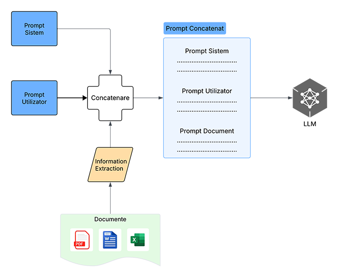Un lucru ce trebuie înțeles este că documentele uploadate sunt automatic concatenate cu prompturile utilizatorilor (textul ce exprima cerința utilizatorului) și cu prompturile de sistem (instrucțiunile generale ce definesc regulile ce guvernează un LLM în conversația cu utilizatorul). Procesul de concatenare a diferitelor prompturi cu informațiile extrase din documentele uploadate de către utilizator este ilustrat în imaginea de mai jos.